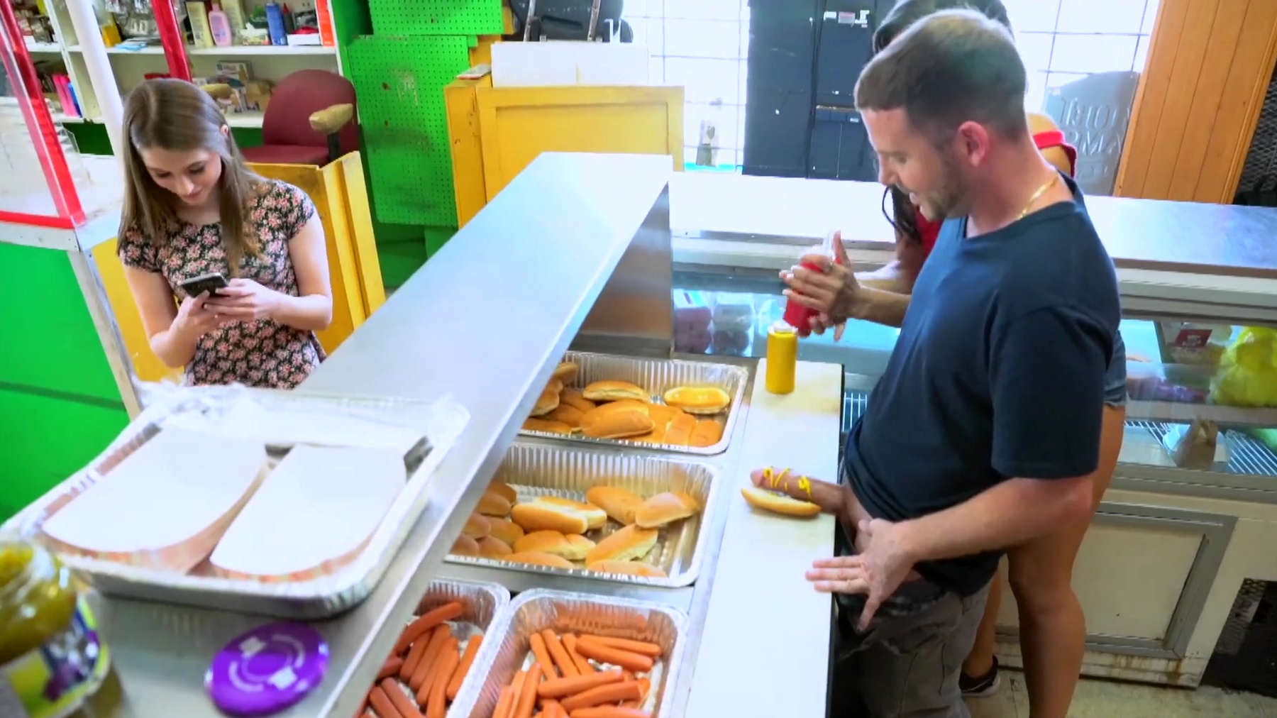 Moneytalks decided to entice people to pull off a stunt by giving away free hot dogs but with a catch of course. If a dude was willing to put his wiener in place of a real hot dog, put toppings on it and be filmed while doing it, we would offer him some cash and also let him have all you can eat hot dogs. As always we had many people decline but sooner or later some brave souls accepted the challenge. One girl who walked in with her boyfriend had such a nice pair of tits we offered her a quick Benjamin to flash us and we eventually got her to suck off her boyfriend with his dick in a hot dog bun smothered in ketchup and mustard. Then, innocent, little Alice walked through the doors inquiring about our special free hot dog offer. We explained it to her and popped Tony's cock into a hot dog bun. If she sucked him off she would get $300. She was worried about getting caught and going to jail for perverted behavior but we told her we would look out and make sure nothing would happen. Tony upped the ante and offered her a cool $1000 to fuck him and she couldn't resist making some fast money for simply enjoying her afternoon of wiener filled fun!